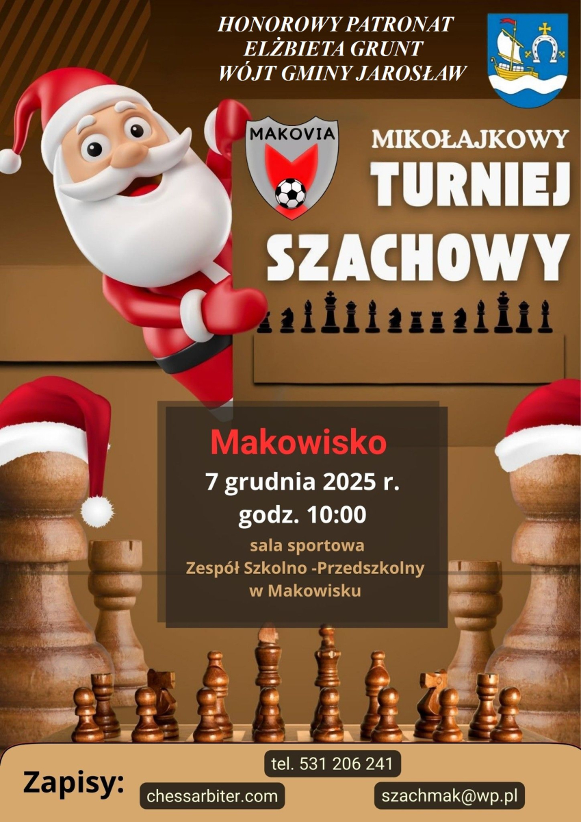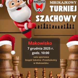 Serdecznie zapraszamy na Mikołajkowy Turniej Szachowy, który mamy przyjemność współorganizować razem z KS Makovia Makowisko oraz Zespołem Szkolno-Przedszkolnym w Makowisku. Turniej odbędzie się w 7 grudnia br. (niedziela) w hali sportowej ZSP w Makowisku: