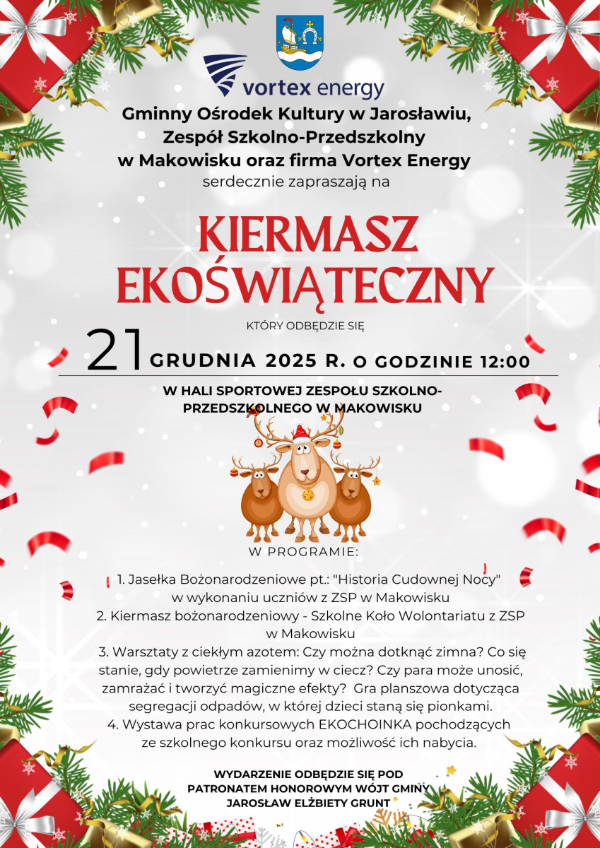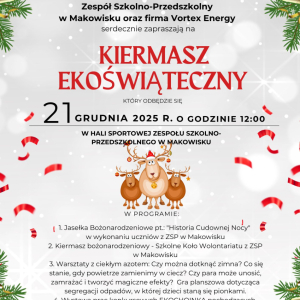 Serdecznie zapraszamy na Kiermasz Ekoświąteczny, który odbędzie się 21 grudnia 2025 r. o godzinie 12:00 w hali sportowej Zespołu Szkolno-Przedszkolnego w Makowisku.